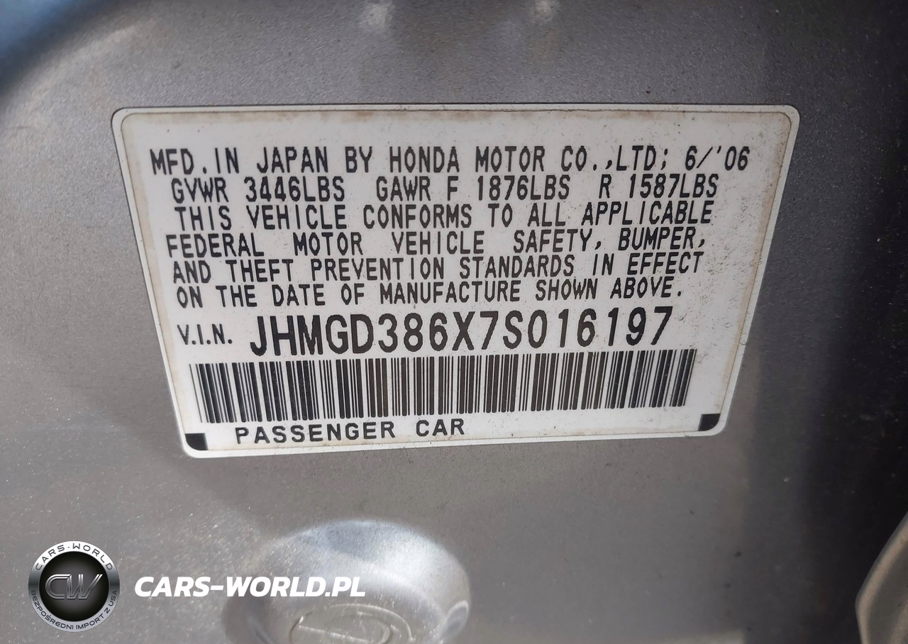 IAAI Nr: I-44842045 VIN: JHMGD386X7S016197 Port: Elizabeth, NJ