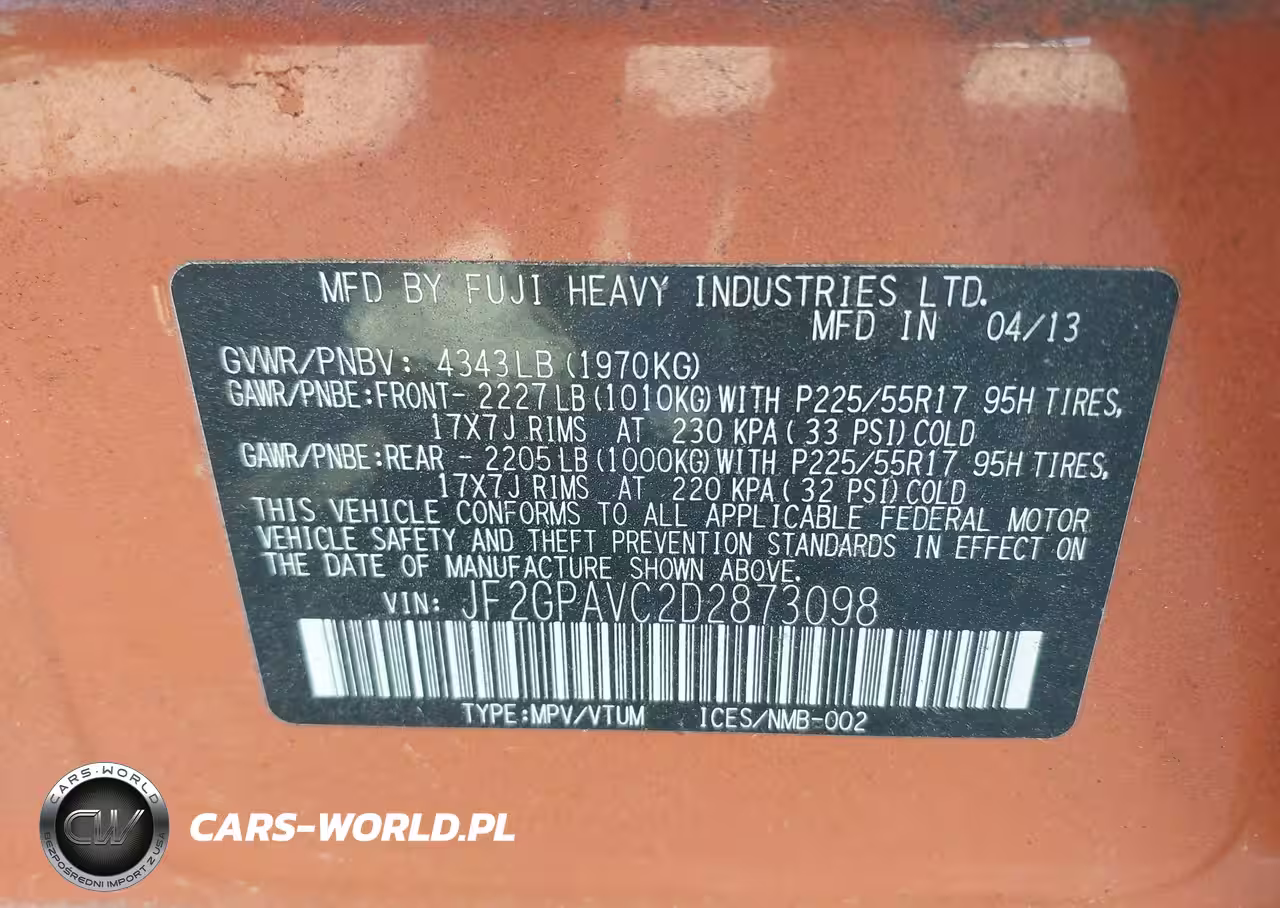 IAAI Nr: I-44846999 VIN: JF2GPAVC2D2873098 Port: Elizabeth, NJ