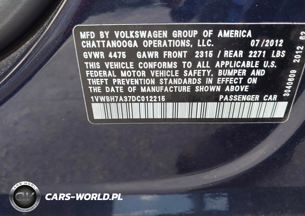 IAAI Nr: I-44849418 VIN: 1VWBH7A37DC012215 Port: Savannah, GA