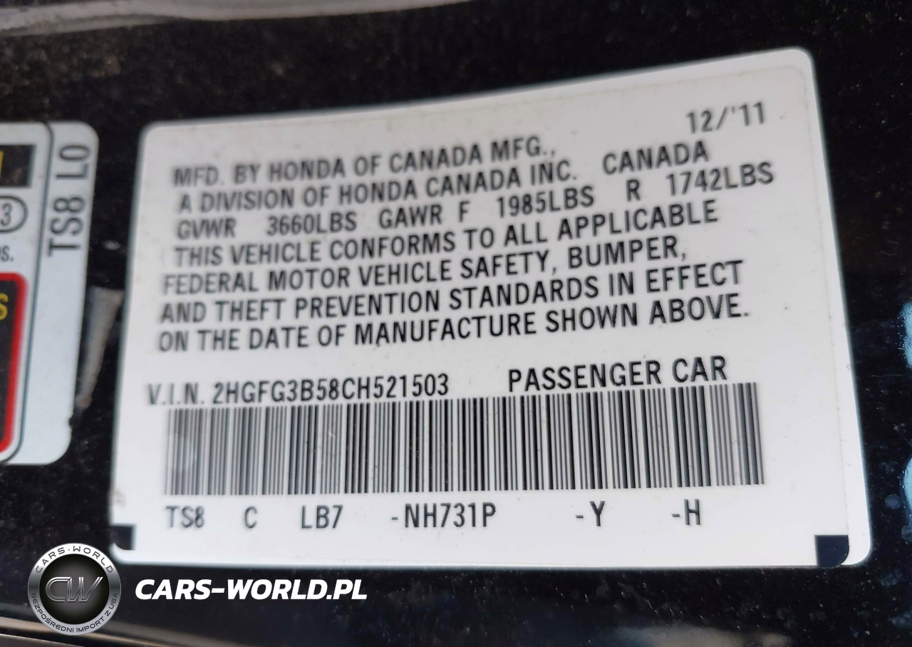 IAAI Nr: I-44852044 VIN: 2HGFG3B58CH521503 Port: Elizabeth, NJ