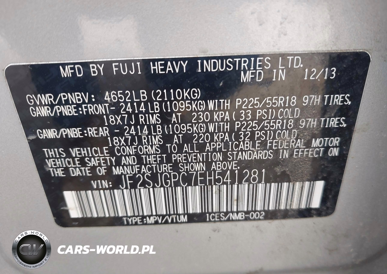 IAAI Nr: I-44868972 VIN: JF2SJGPC7EH541281 Port: Indianapolis, IN