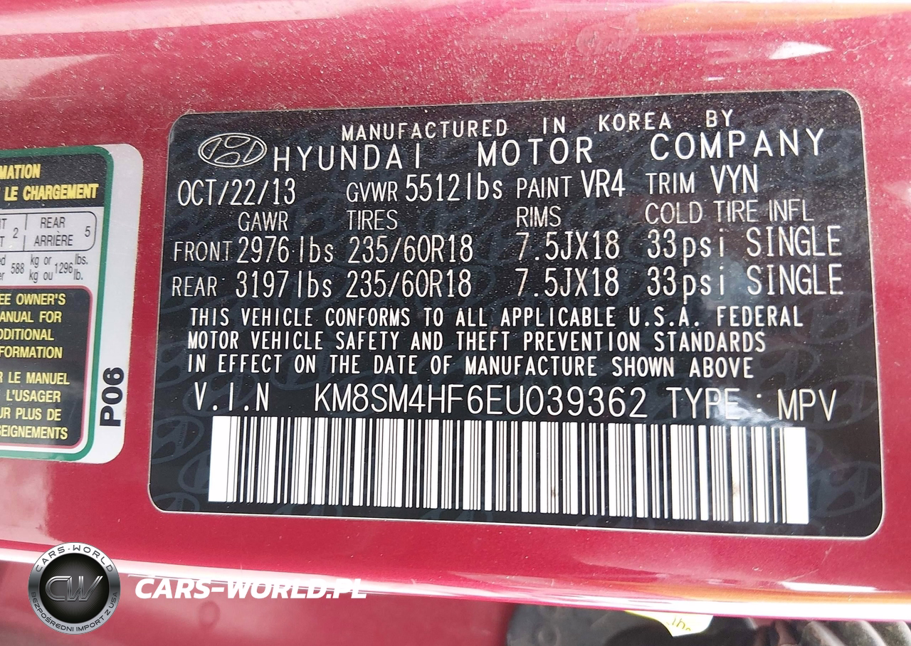 IAAI Nr: I-44873287 VIN: KM8SM4HF6EU039362 Port: Houston, TX