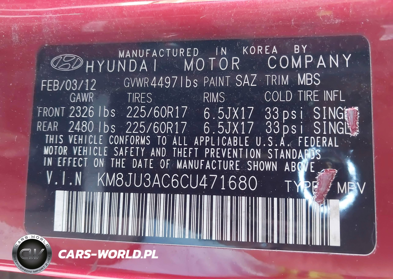 IAAI Nr: I-44880212 VIN: KM8JU3AC6CU471680 Port: Los Angeles, CA