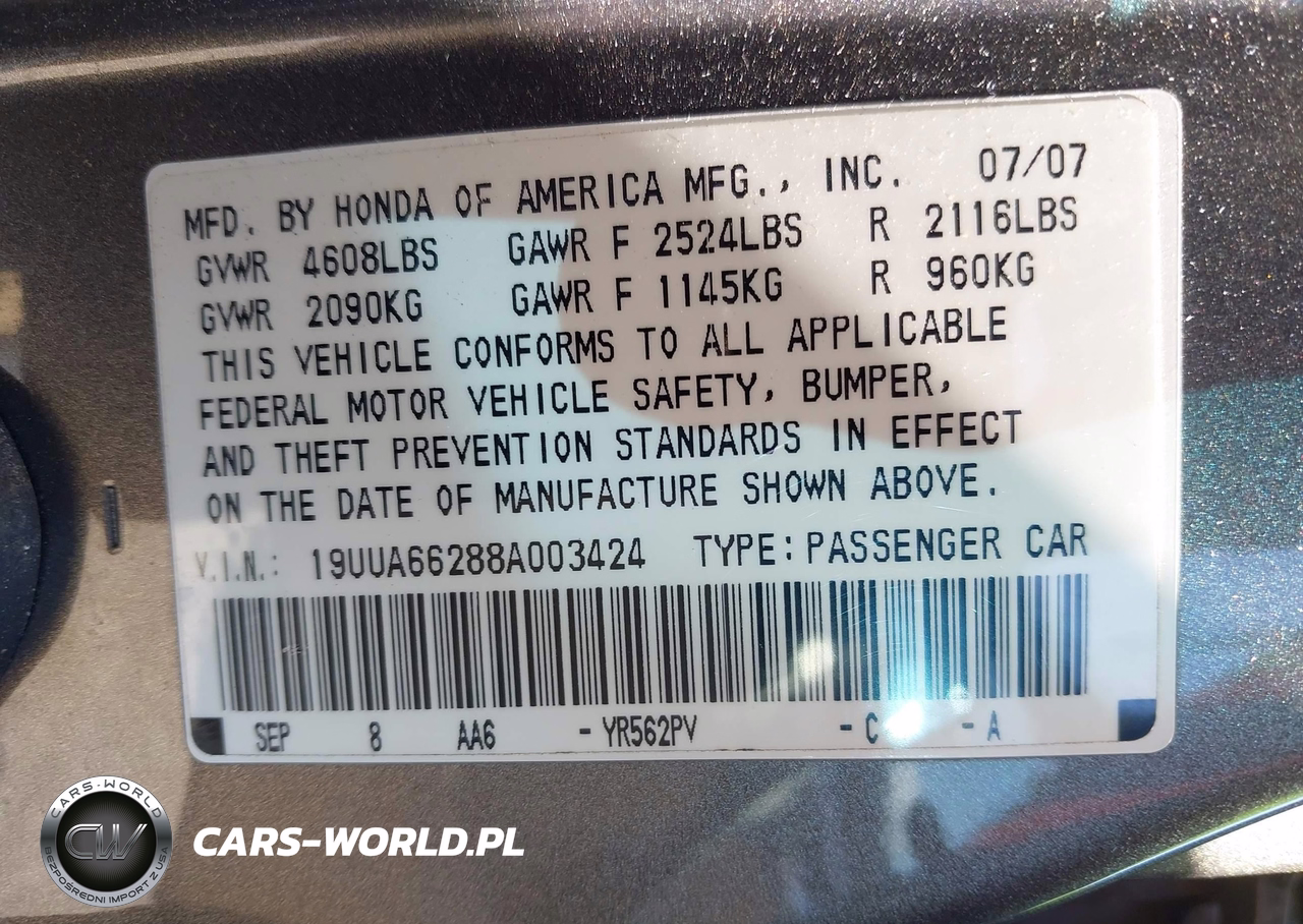 IAAI Nr: I-44880404 VIN: 19UUA66288A003424 Port: Elizabeth, NJ