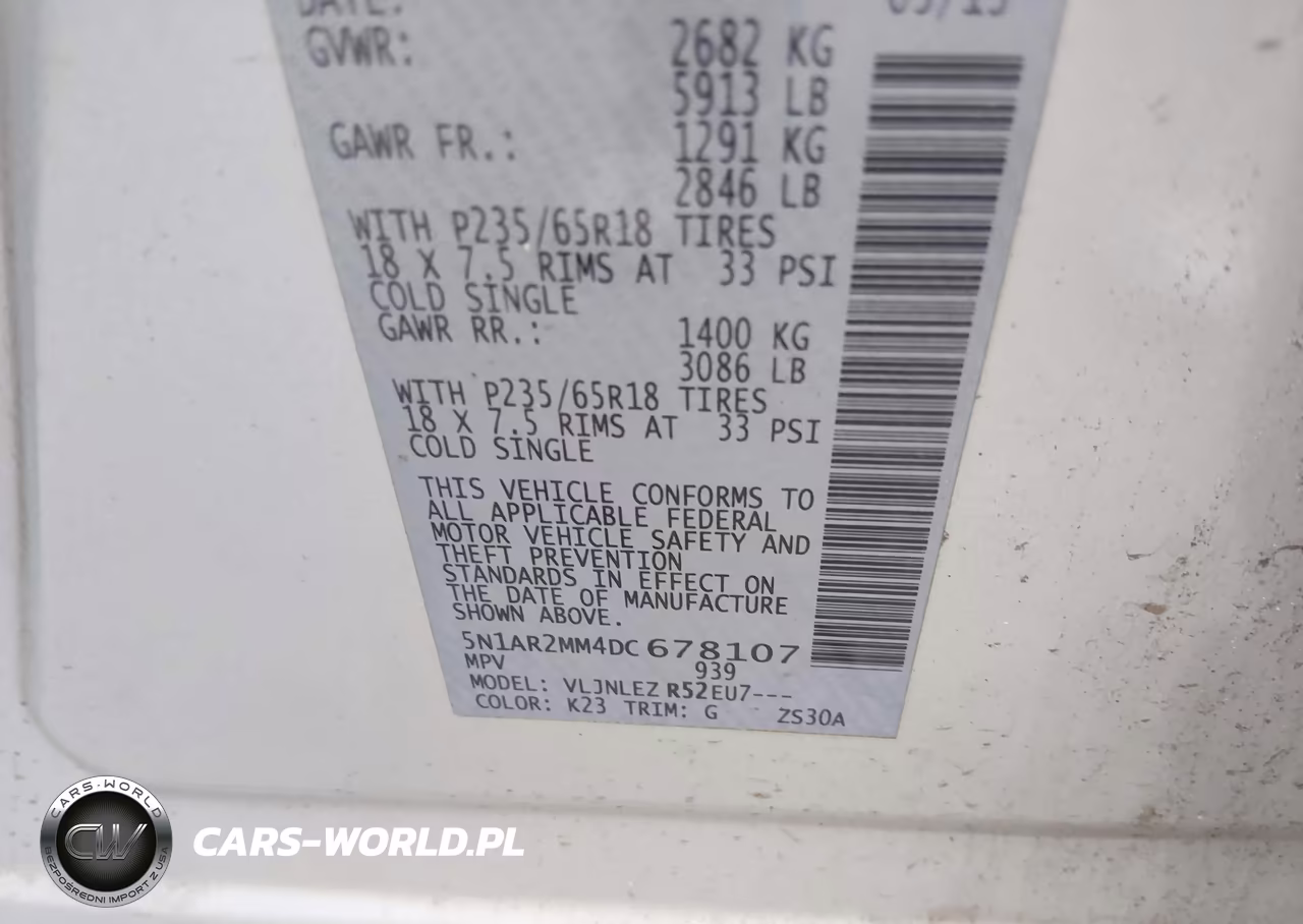 IAAI Nr: I-44883068 VIN: 5N1AR2MM4DC678107 Port: Elizabeth, NJ
