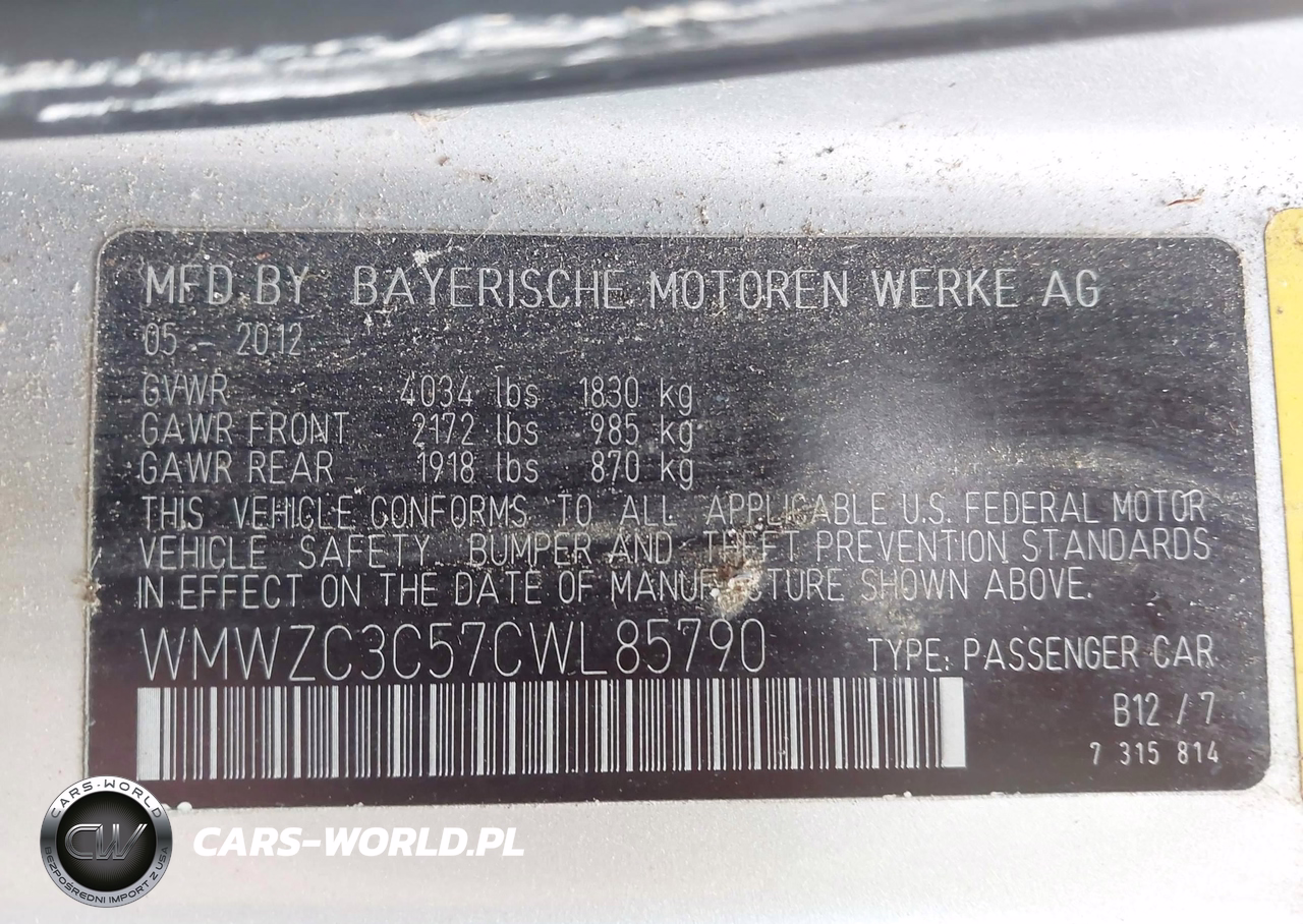 IAAI Nr: I-44890793 VIN: WMWZC3C57CWL85790 Port: Indianapolis, IN
