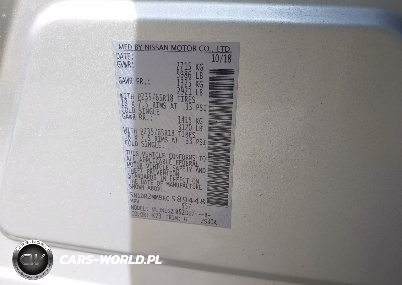 IAAI Nr: I-44905752 VIN: 5N1DR2MM9KC589448 Port: Elizabeth, NJ